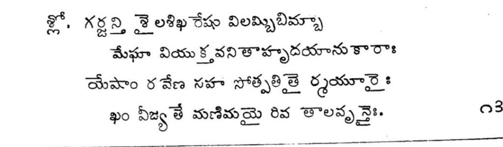 “పర్వత శిఖరాలపై వ్రేలాడుతూ మేఘాలు గర్జిస్తున్నాయి. ఆ గర్జన విరహిణీ హృదయ ఘోషను అనుకరిస్తోంది. ఆ శబ్దాన్ని వినగానే నెమళ్ళు ఒక్కసారిగా పైకెగిరి , ఆకాశాన్ని మణిమయమైన విసనకర్రలతో వీస్తున్నాయి. అంటే అవి పురి విప్పి నర్తిస్తూ ఉంటే విచ్చుకొన్న వాటి పింఛాలు మణులు పొదిగిన విసనకర్రలతో ఆకాశాన్ని వీస్తున్నట్టు ఉంది. ఇంతే ఇందులో ఉన్నది… కానీ అవతల ఉన్నది మా మాష్టారు కదా…